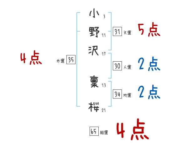 外運![]() | 小野沢稟桜さんの外運は35画の4つ星!温厚な性格で感受性が高い。穏和な性格で人望が厚い。 生活面を象徴する運勢です。外部から受ける影響力を表し、結婚運、家庭運や職場、環境への順応性を表します。 |