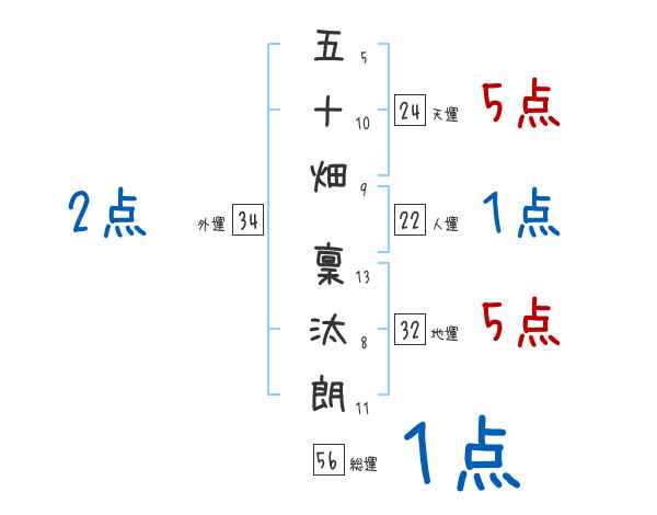 人運![]() | 五十畑稟汰朗さんの人運は22画の1つ星!努力することが苦手ないっぽう手先が器用。芸術性にも優れる。 性格や才能などを表す2番目に重要な運勢です。人間関係や協調性、社会的な成功に影響します。主に20歳から50歳ぐらいまでの中年期の運勢を表します。 |