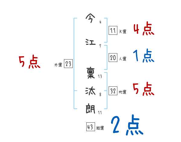 外運![]() | 今江稟汰朗さんの外運は23画の5つ星!想像力に優れ活力がある。一代で成功し名誉を手に入れる。 生活面を象徴する運勢です。外部から受ける影響力を表し、結婚運、家庭運や職場、環境への順応性を表します。 |