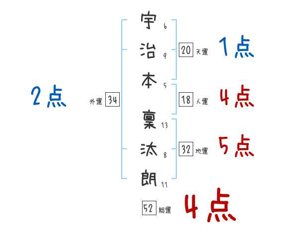 地運![]() | 宇治本稟汰朗さんの地運は32画の5つ星!柔軟性があり成功する。チャンスが多く金運が良い。 個性を表す基礎的な運勢です。性格形成や対人関係、行動力など家庭環境に影響されます。主に誕生してから20歳くらいまでの若年期の運勢を表します。 |