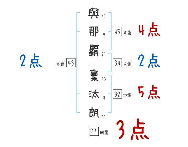 天運![]() | 與那覇稟汰朗さんの天運は45画の4つ星!もくもくと物事を進め達成する。地味な努力家。 家系が持つ宿命的な運勢を表します。祖先から受け継いだ苗字ですので自分の力が及びません。家柄を象徴します。 |