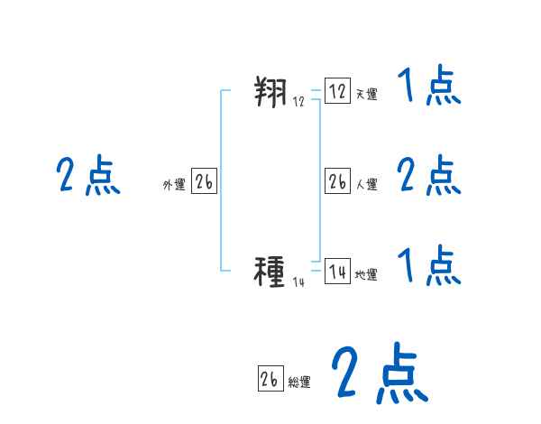 総運![]() | 翔種さんの総運は26画の2つ星!波瀾万丈かも。信頼できる人を大事にしましょう。 あなたの人生を表す1番重要な運勢です。生涯を通じて影響する総合運となり、主に50歳以降の晩年期に影響を及ぼします。 |