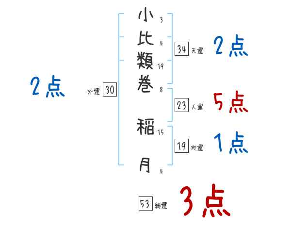 人運![]() | 小比類巻稲月さんの人運は23画の5つ星!想像力に優れ活力がある。一代で成功し名誉を手に入れる。 性格や才能などを表す2番目に重要な運勢です。人間関係や協調性、社会的な成功に影響します。主に20歳から50歳ぐらいまでの中年期の運勢を表します。 |
