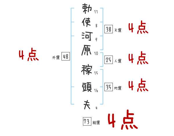 天運![]() | 勅使河原稼頭夫さんの天運は38画の4つ星!温厚な性格で技術的な才能を発揮する。職人的な仕事に向いている。 家系が持つ宿命的な運勢を表します。祖先から受け継いだ苗字ですので自分の力が及びません。家柄を象徴します。 |