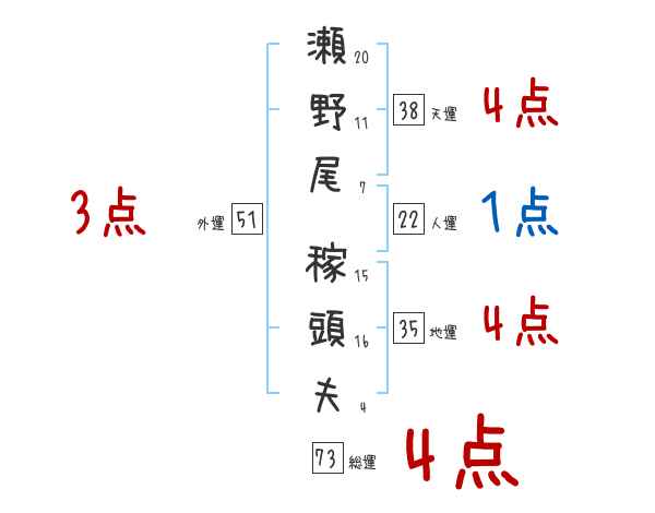 瀬野尾稼頭夫さんの画数の鑑定結果