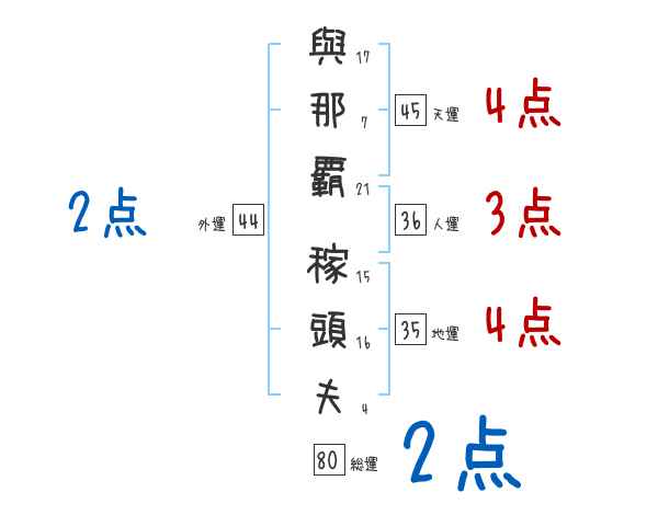 天運![]() | 與那覇稼頭夫さんの天運は45画の4つ星!もくもくと物事を進め達成する。地味な努力家。 家系が持つ宿命的な運勢を表します。祖先から受け継いだ苗字ですので自分の力が及びません。家柄を象徴します。 |