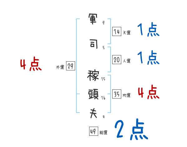 外運![]() | 軍司稼頭夫さんの外運は29画の4つ星!完全主義で才能がある。厳格な心の持ち主。 生活面を象徴する運勢です。外部から受ける影響力を表し、結婚運、家庭運や職場、環境への順応性を表します。 |