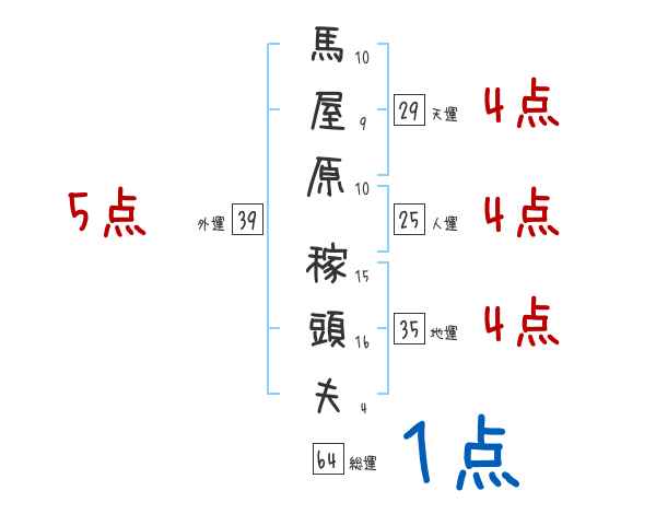 外運![]() | 馬屋原稼頭夫さんの外運は39画の5つ星!社交性に優れ人望が厚い。人の上に立ち成功する。 生活面を象徴する運勢です。外部から受ける影響力を表し、結婚運、家庭運や職場、環境への順応性を表します。 |
