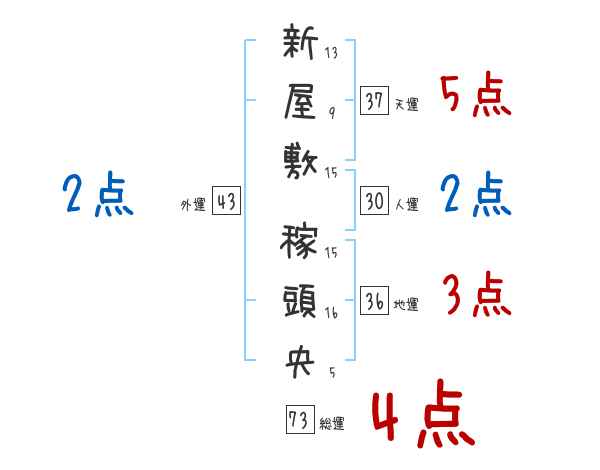 天運![]() | 新屋敷稼頭央さんの天運は37画の5つ星!努力家で順応性に優れる。現実的な考え方ができ忠実に物事をこなす。 家系が持つ宿命的な運勢を表します。祖先から受け継いだ苗字ですので自分の力が及びません。家柄を象徴します。 |