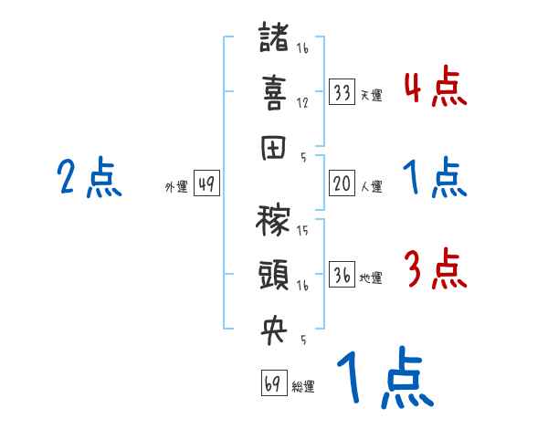 諸喜田稼頭央さんの画数の鑑定結果