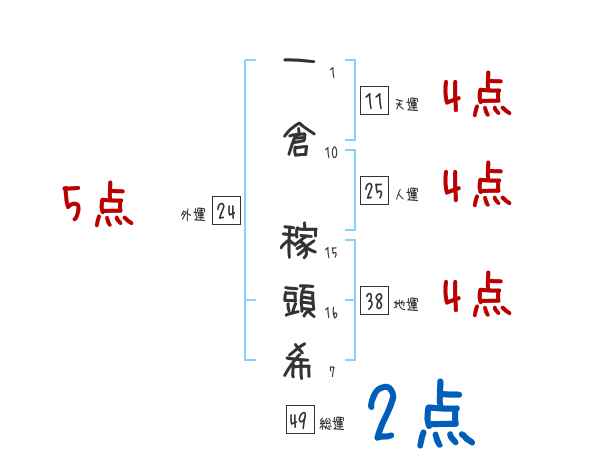外運![]() | 一倉稼頭希さんの外運は24画の5つ星!家庭運が良く順調な人生。金運にも恵まれる。 生活面を象徴する運勢です。外部から受ける影響力を表し、結婚運、家庭運や職場、環境への順応性を表します。 |
