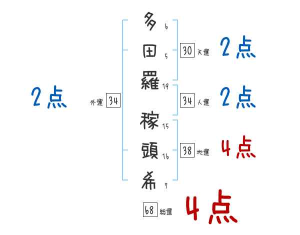 天運![]() | 多田羅稼頭希さんの天運は30画の2つ星!浮き沈みの激しさに注意しましょう。 家系が持つ宿命的な運勢を表します。祖先から受け継いだ苗字ですので自分の力が及びません。家柄を象徴します。 |