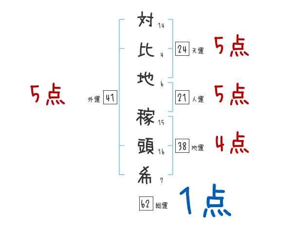 天運![]() | 対比地稼頭希さんの天運は24画の5つ星!家庭運が良く順調な人生。金運にも恵まれる。 家系が持つ宿命的な運勢を表します。祖先から受け継いだ苗字ですので自分の力が及びません。家柄を象徴します。 |