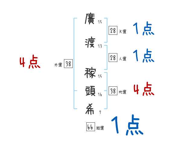 外運![]() | 廣渡稼頭希さんの外運は38画の4つ星!温厚な性格で技術的な才能を発揮する。職人的な仕事に向いている。 生活面を象徴する運勢です。外部から受ける影響力を表し、結婚運、家庭運や職場、環境への順応性を表します。 |