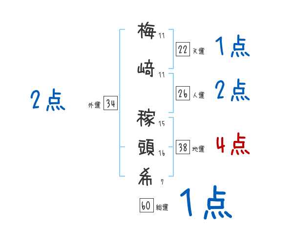 天運![]() | 梅﨑稼頭希さんの天運は22画の1つ星!努力することが苦手ないっぽう手先が器用。芸術性にも優れる。 家系が持つ宿命的な運勢を表します。祖先から受け継いだ苗字ですので自分の力が及びません。家柄を象徴します。 |