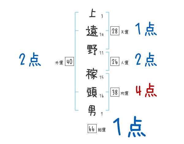 総運![]() | 上遠野稼頭男さんの総運は66画の1つ星!迷うことが多く挫折しやすい傾向が。辛抱強く物事に取り組みましょう。 あなたの人生を表す1番重要な運勢です。生涯を通じて影響する総合運となり、主に50歳以降の晩年期に影響を及ぼします。 |