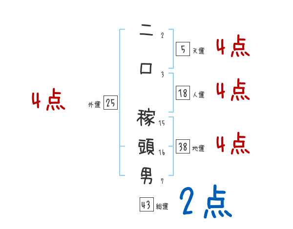 天運![]() | 二口稼頭男さんの天運は5画の4つ星!健康で安泰。協調性に優れ、財産に恵まれる。 家系が持つ宿命的な運勢を表します。祖先から受け継いだ苗字ですので自分の力が及びません。家柄を象徴します。 |