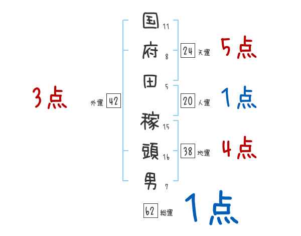 外運![]() | 国府田稼頭男さんの外運は42画の3つ星!病気に注意。多芸であるが消極的でおとなしい。 生活面を象徴する運勢です。外部から受ける影響力を表し、結婚運、家庭運や職場、環境への順応性を表します。 |