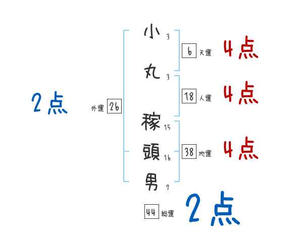総運![]() | 小丸稼頭男さんの総運は44画の2つ星!誠実で慎重な性格。物事を考えすぎないように注意しましょう。 あなたの人生を表す1番重要な運勢です。生涯を通じて影響する総合運となり、主に50歳以降の晩年期に影響を及ぼします。 |