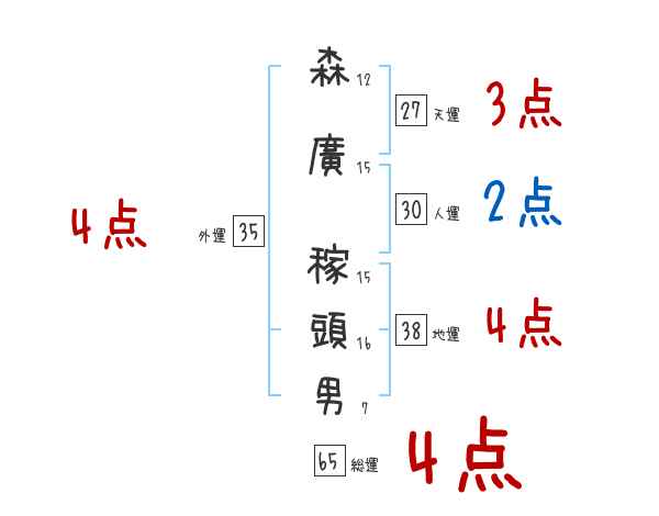 外運![]() | 森廣稼頭男さんの外運は35画の4つ星!温厚な性格で感受性が高い。穏和な性格で人望が厚い。 生活面を象徴する運勢です。外部から受ける影響力を表し、結婚運、家庭運や職場、環境への順応性を表します。 |