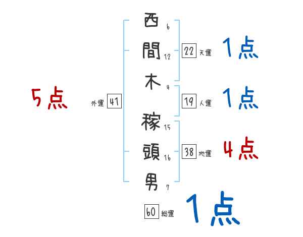 天運![]() | 西間木稼頭男さんの天運は22画の1つ星!努力することが苦手ないっぽう手先が器用。芸術性にも優れる。 家系が持つ宿命的な運勢を表します。祖先から受け継いだ苗字ですので自分の力が及びません。家柄を象徴します。 |