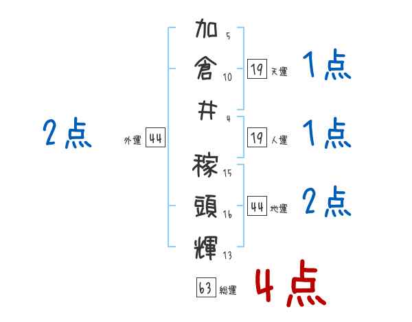 外運![]() | 加倉井稼頭輝さんの外運は44画の2つ星!誠実で慎重な性格。物事を考えすぎないように注意しましょう。 生活面を象徴する運勢です。外部から受ける影響力を表し、結婚運、家庭運や職場、環境への順応性を表します。 |