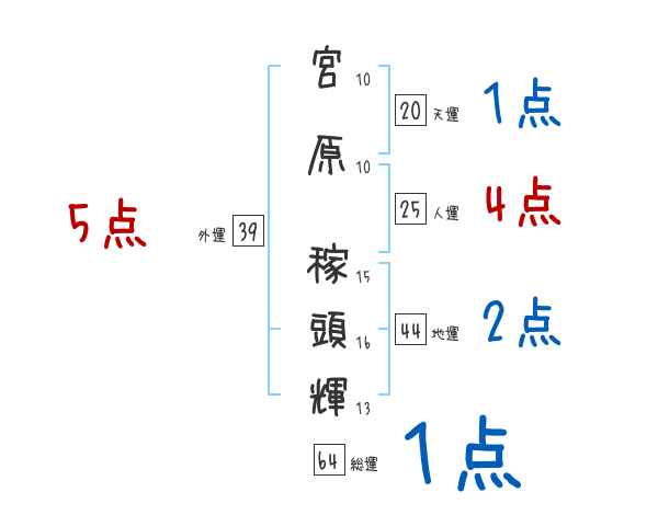 外運![]() | 宮原稼頭輝さんの外運は39画の5つ星!社交性に優れ人望が厚い。人の上に立ち成功する。 生活面を象徴する運勢です。外部から受ける影響力を表し、結婚運、家庭運や職場、環境への順応性を表します。 |