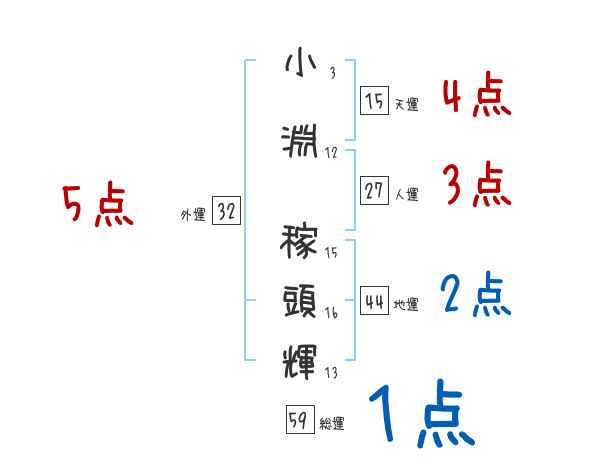 外運![]() | 小淵稼頭輝さんの外運は32画の5つ星!柔軟性があり成功する。チャンスが多く金運が良い。 生活面を象徴する運勢です。外部から受ける影響力を表し、結婚運、家庭運や職場、環境への順応性を表します。 |