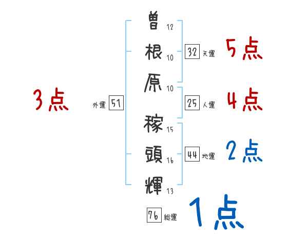 曽根原稼頭輝さんの画数の鑑定結果