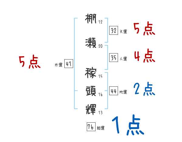 天運![]() | 棚瀬稼頭輝さんの天運は32画の5つ星!柔軟性があり成功する。チャンスが多く金運が良い。 家系が持つ宿命的な運勢を表します。祖先から受け継いだ苗字ですので自分の力が及びません。家柄を象徴します。 |