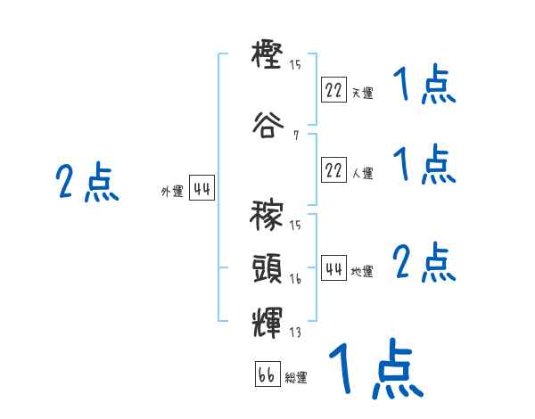 天運![]() | 樫谷稼頭輝さんの天運は22画の1つ星!努力することが苦手ないっぽう手先が器用。芸術性にも優れる。 家系が持つ宿命的な運勢を表します。祖先から受け継いだ苗字ですので自分の力が及びません。家柄を象徴します。 |