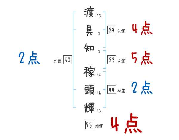 渡具知稼頭輝さんの画数の鑑定結果