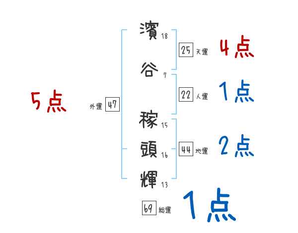 外運![]() | 濱谷稼頭輝さんの外運は47画の5つ星!実力が開花し発展する円満な人生。財に恵まれる。 生活面を象徴する運勢です。外部から受ける影響力を表し、結婚運、家庭運や職場、環境への順応性を表します。 |