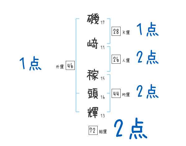 天運![]() | 磯﨑稼頭輝さんの天運は28画の1つ星!家庭環境に注意。スポーツで活躍できる能力があるかも。 家系が持つ宿命的な運勢を表します。祖先から受け継いだ苗字ですので自分の力が及びません。家柄を象徴します。 |