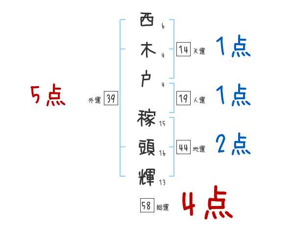 外運![]() | 西木戸稼頭輝さんの外運は39画の5つ星!社交性に優れ人望が厚い。人の上に立ち成功する。 生活面を象徴する運勢です。外部から受ける影響力を表し、結婚運、家庭運や職場、環境への順応性を表します。 |