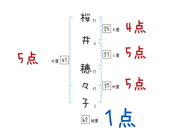 天運![]() | 桜井穂々子さんの天運は25画の4つ星!個性があり才能があふれる。強運の持ち主で発展する。 家系が持つ宿命的な運勢を表します。祖先から受け継いだ苗字ですので自分の力が及びません。家柄を象徴します。 |