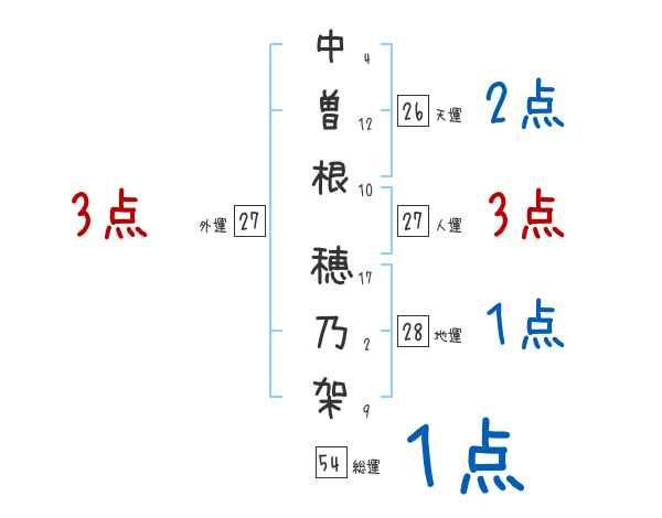 外運![]() | 中曽根穂乃架さんの外運は27画の3つ星!頭脳明晰だが強情で摩擦が多い傾向。孤立に注意。 生活面を象徴する運勢です。外部から受ける影響力を表し、結婚運、家庭運や職場、環境への順応性を表します。 |