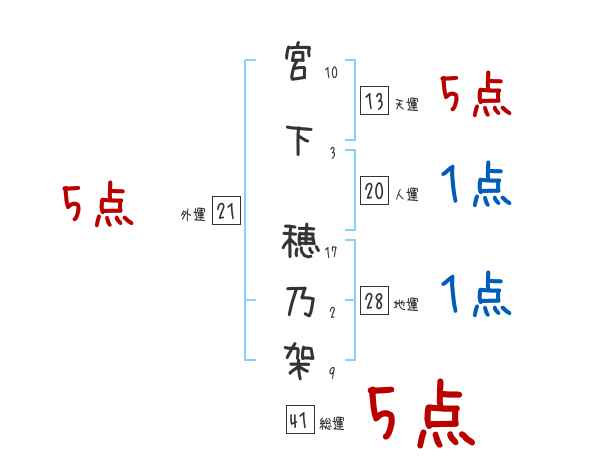 外運![]() | 宮下穂乃架さんの外運は21画の5つ星!統率力がある。独立し成功する。名誉を手に入れる。 生活面を象徴する運勢です。外部から受ける影響力を表し、結婚運、家庭運や職場、環境への順応性を表します。 |