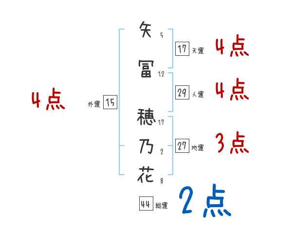 総運![]() | 矢冨穂乃花さんの総運は44画の2つ星!誠実で慎重な性格。物事を考えすぎないように注意しましょう。 あなたの人生を表す1番重要な運勢です。生涯を通じて影響する総合運となり、主に50歳以降の晩年期に影響を及ぼします。 |