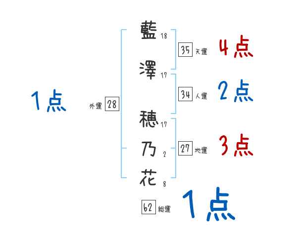 天運![]() | 藍澤穂乃花さんの天運は35画の4つ星!温厚な性格で感受性が高い。穏和な性格で人望が厚い。 家系が持つ宿命的な運勢を表します。祖先から受け継いだ苗字ですので自分の力が及びません。家柄を象徴します。 |