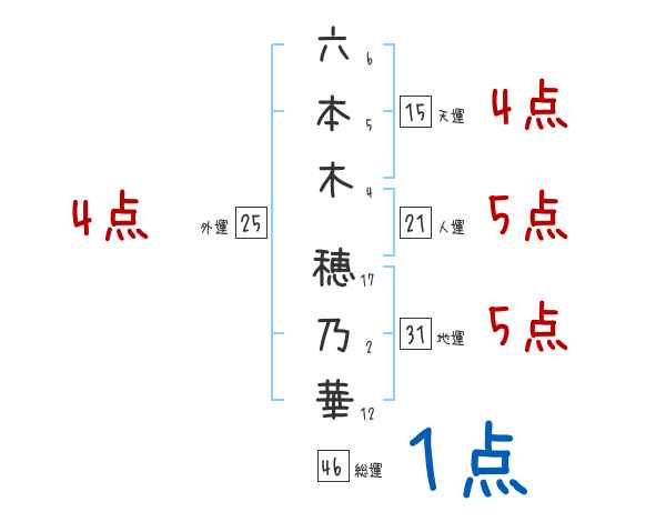 総運![]() | 六本木穂乃華さんの総運は46画の1つ星!迷走することが多く苦労するかも。目先のことにとらわれないように。 あなたの人生を表す1番重要な運勢です。生涯を通じて影響する総合運となり、主に50歳以降の晩年期に影響を及ぼします。 |