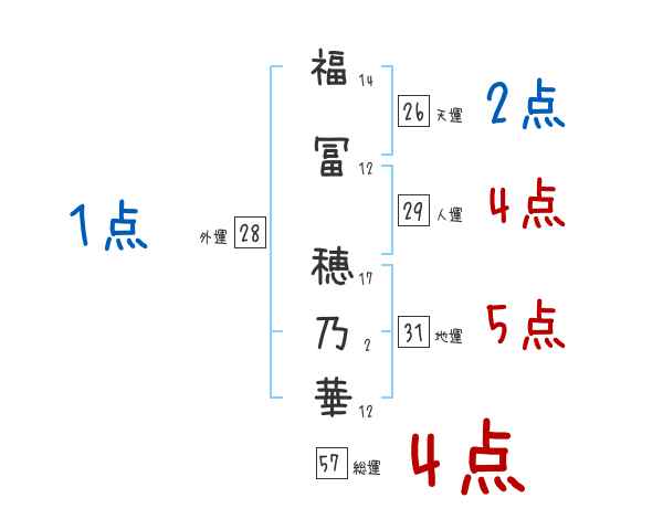 天運![]() | 福冨穂乃華さんの天運は26画の2つ星!波瀾万丈かも。信頼できる人を大事にしましょう。 家系が持つ宿命的な運勢を表します。祖先から受け継いだ苗字ですので自分の力が及びません。家柄を象徴します。 |