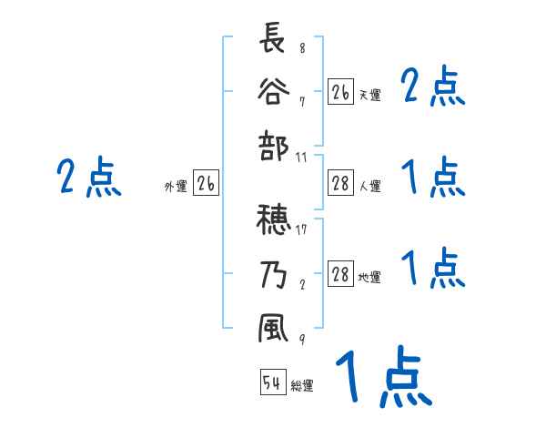 天運![]() | 長谷部穂乃風さんの天運は26画の2つ星!波瀾万丈かも。信頼できる人を大事にしましょう。 家系が持つ宿命的な運勢を表します。祖先から受け継いだ苗字ですので自分の力が及びません。家柄を象徴します。 |