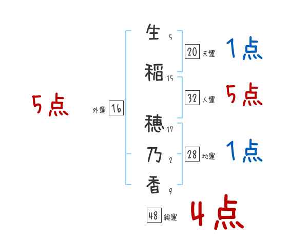外運![]() | 生稲穂乃香さんの外運は16画の5つ星!人望が厚く大きく発展する。逆転成功が見える。 生活面を象徴する運勢です。外部から受ける影響力を表し、結婚運、家庭運や職場、環境への順応性を表します。 |