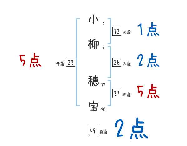 外運![]() | 小柳穂宝さんの外運は23画の5つ星!想像力に優れ活力がある。一代で成功し名誉を手に入れる。 生活面を象徴する運勢です。外部から受ける影響力を表し、結婚運、家庭運や職場、環境への順応性を表します。 |