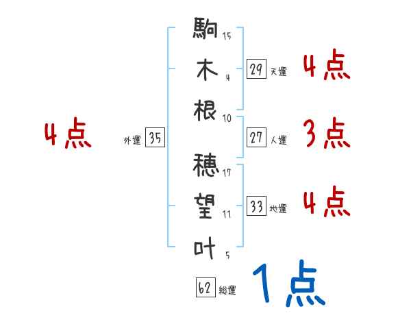 外運![]() | 駒木根穂望叶さんの外運は35画の4つ星!温厚な性格で感受性が高い。穏和な性格で人望が厚い。 生活面を象徴する運勢です。外部から受ける影響力を表し、結婚運、家庭運や職場、環境への順応性を表します。 |