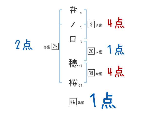 外運![]() | 井ノ口穂桜さんの外運は26画の2つ星!波瀾万丈かも。信頼できる人を大事にしましょう。 生活面を象徴する運勢です。外部から受ける影響力を表し、結婚運、家庭運や職場、環境への順応性を表します。 |