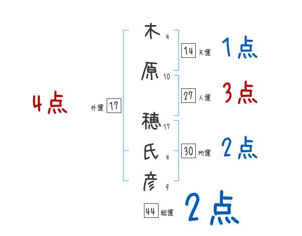 外運![]() | 木原穂氏彦さんの外運は17画の4つ星!積極的な行動力。地位を気づき財産を手に入れる。純粋な心と直感力。 生活面を象徴する運勢です。外部から受ける影響力を表し、結婚運、家庭運や職場、環境への順応性を表します。 |