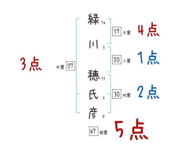 外運![]() | 緑川穂氏彦さんの外運は27画の3つ星!頭脳明晰だが強情で摩擦が多い傾向。孤立に注意。 生活面を象徴する運勢です。外部から受ける影響力を表し、結婚運、家庭運や職場、環境への順応性を表します。 |