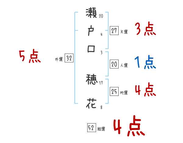 外運![]() | 瀬戸口穂花さんの外運は32画の5つ星!柔軟性があり成功する。チャンスが多く金運が良い。 生活面を象徴する運勢です。外部から受ける影響力を表し、結婚運、家庭運や職場、環境への順応性を表します。 |